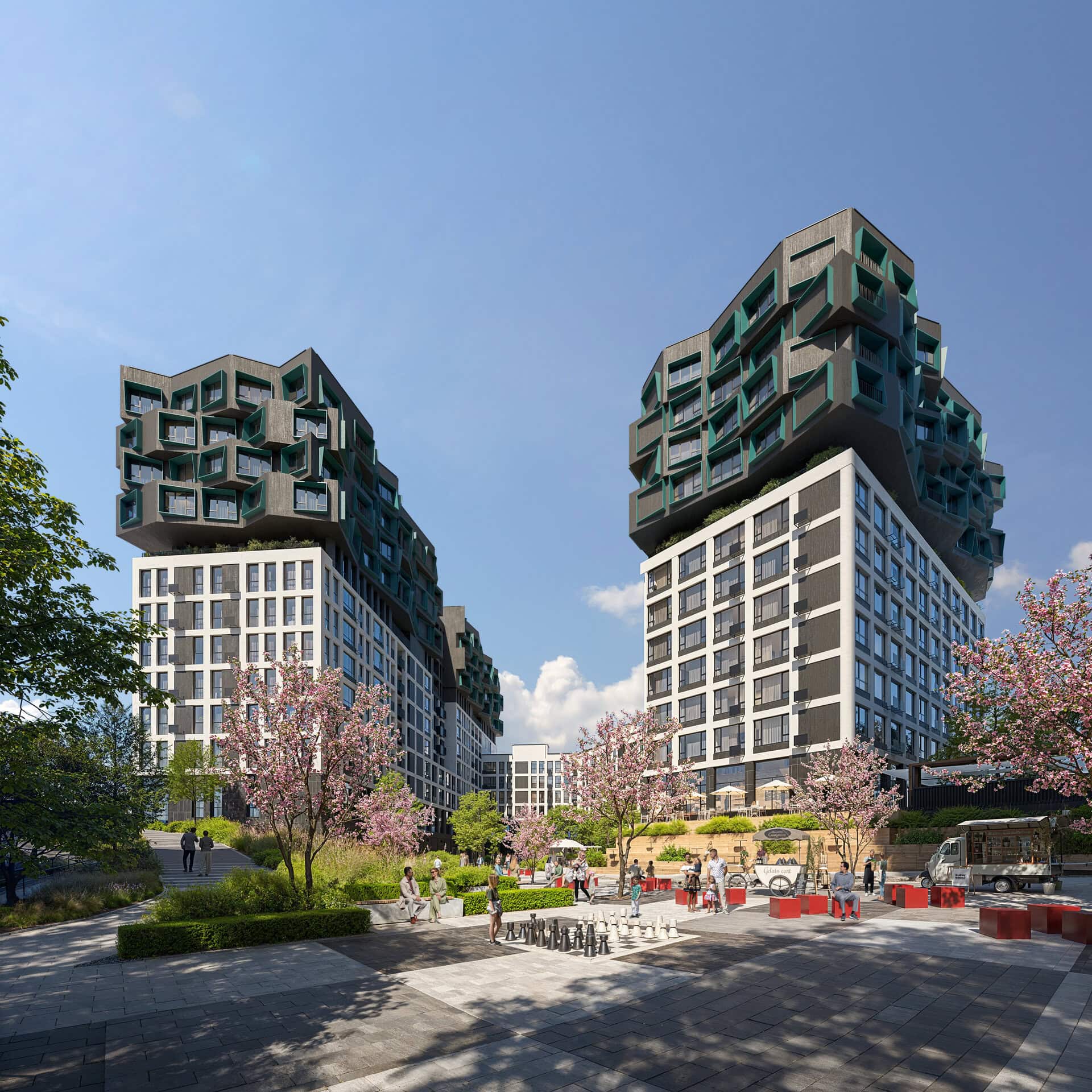 Навколо комплексу розташовані 6 торгових центрів, ТРЦ «River Mall» , ТЦ «Аркадія», ТРЦ «Аладдін» та ТРЦ «Піраміда», Епіцентрі та гіпермаркет «Metro Cash & Carry».а також кафе, ресторани, спортивні клуби та супермаркети. Поруч з ЖК є приватний дитячий садочок «Мандрик» та приватна школа повного дня «Inventor School» з дитячим садком, а також приватні школи «КМДШ» та «Clever School», Київська інженерна гімназія, загальноосвітні школи №62, №314, №329.